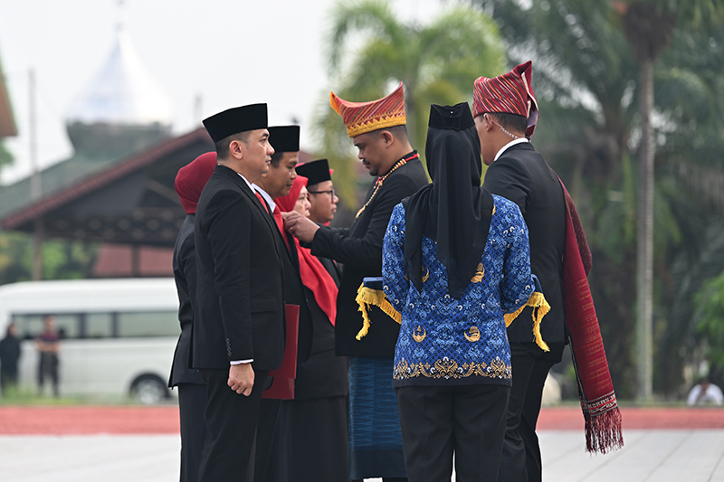 Wakil Gubernur (Wagub) Sumut Surya, dan Sekretaris Daerah Provinsi (Sekdaprov) Sumut Togap Simangunsong kompak mengenakan baju adat, saat upacara Kemerdekaan RI ke-80. Kegiatan tersebut berlangsung di Astaka, Jalan William Iskandar Deliserdang, Minggu (17/8/2025).