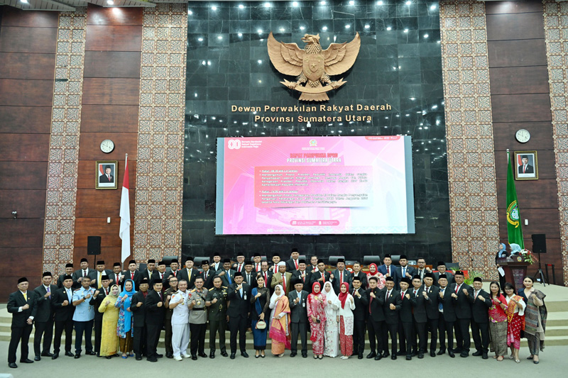 MEDAN, 15/8 - Gubernur Sumatera Utara (Sumut) Bobby Nasution bersama Wakil Gubernur (Wagub) Surya, mendengarkan pidato kenegaraan Presiden RI Prabowo Subianto, dalam rangka Hari Ulang Tahun (HUT) ke-80 Kemerdekaan Republik Indonesia. Acara yang berlangsung secara virtual itu dilaksanakan di Gedung Paripurna DPRD Sumut, Jalan Imam Bonjol Medan, Jumat (15/8/2025).