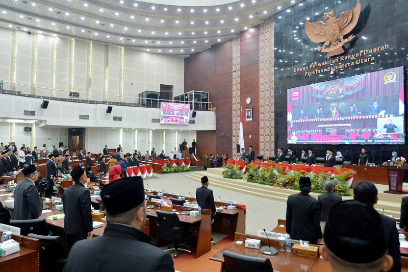 MEDAN, 15/8 - Gubernur Sumatera Utara (Sumut) Bobby Nasution bersama Wakil Gubernur (Wagub) Surya, menghadiri Rapat Paripurna DPRD Sumut dengan agenda mendengarkan Pidato Kenegaraan Presiden RI dalam rangka Penyampaian Pengantar/Keterangan Atas RUU tentang APBN Tahun Anggaran 2026. Acara yang berlangsung secara virtual itu dilaksanakan di Gedung Paripurna DPRD Sumut, Jalan Imam Bonjol Medan, Jumat (15/8/2025).